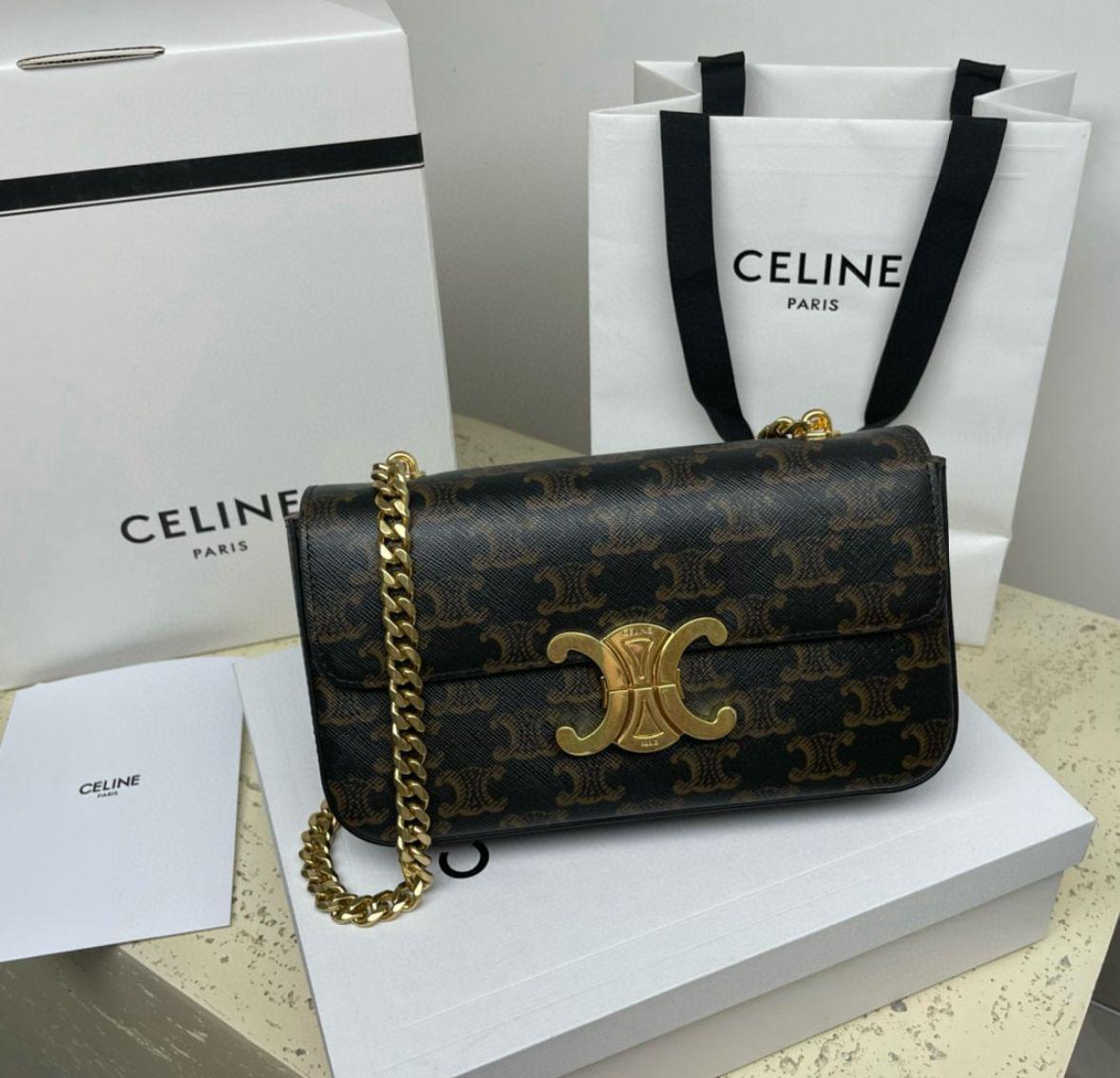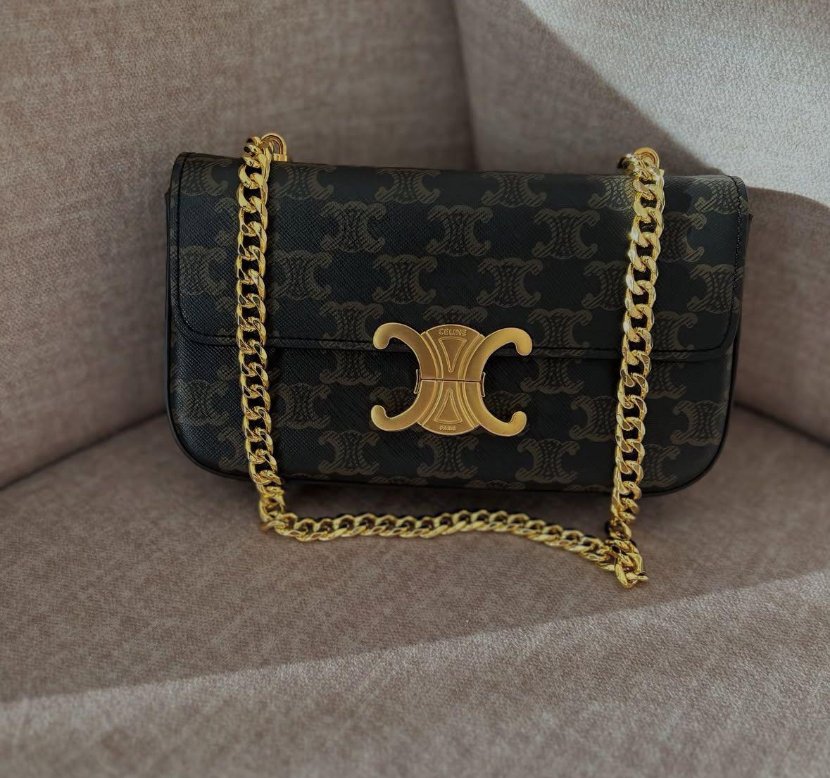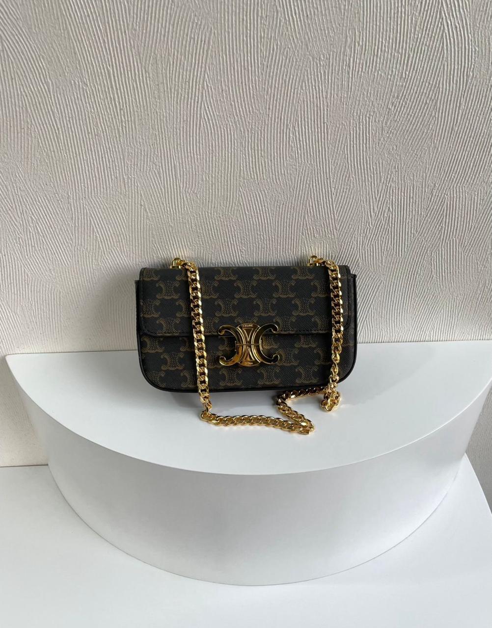 This stunning CLN-style premium bag features the iconic Triomphe pattern with a bold gold-tone emblem and chain strap — perfect for classy outings, parties, travel, and everyday luxury looks 😍