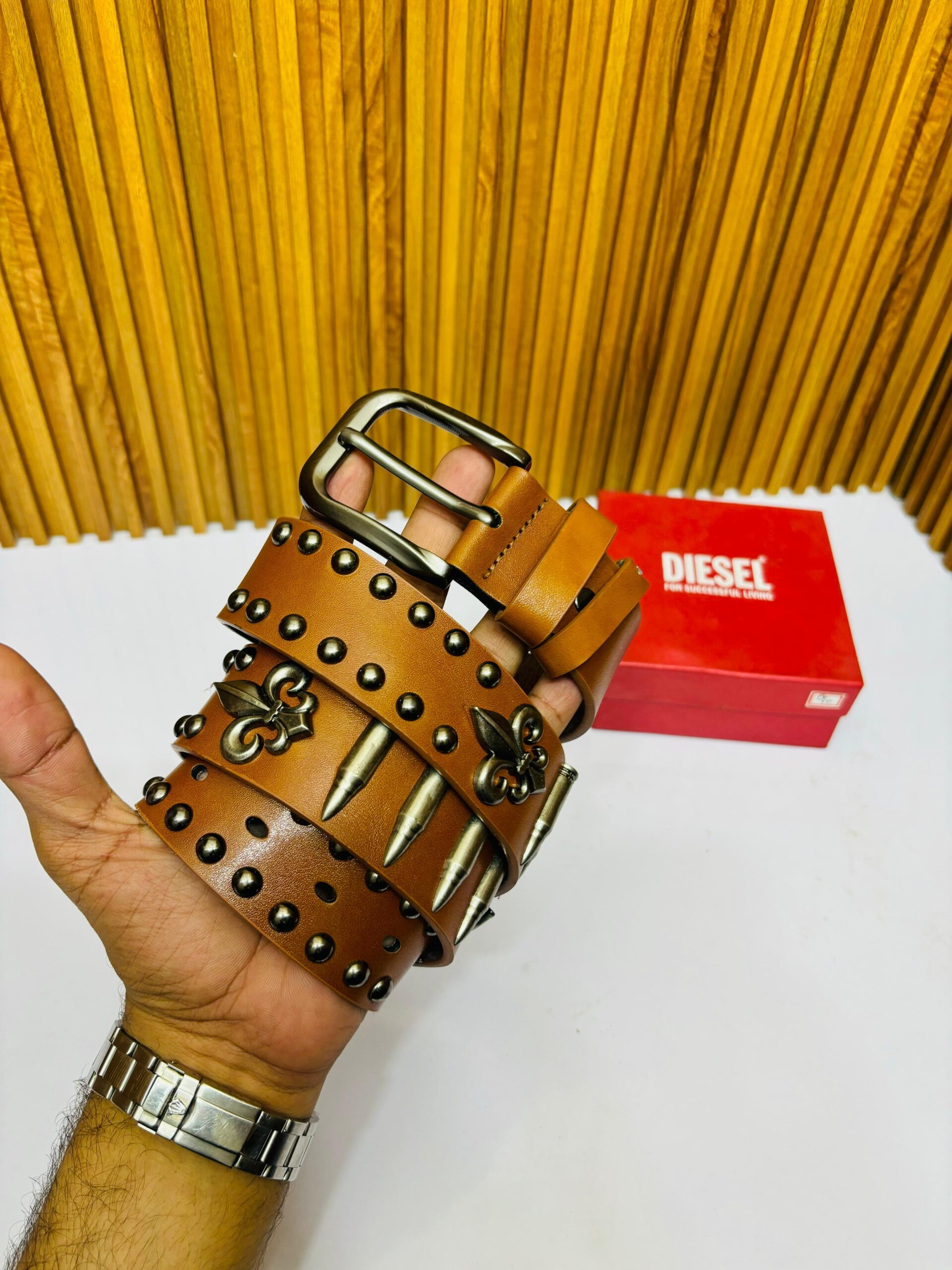Upgrade your style with this DSL premium leather belt! Crafted from high-quality, durable leather, this belt boasts a bold, edgy design featuring striking stud and bullet details. Perfect for making a statement, it’s ideal for casual wear, street style, or adding a bit of rock ‘n’ roll to your look. The sturdy metal buckle completes the look, making it a must-have accessory for fashion lovers!