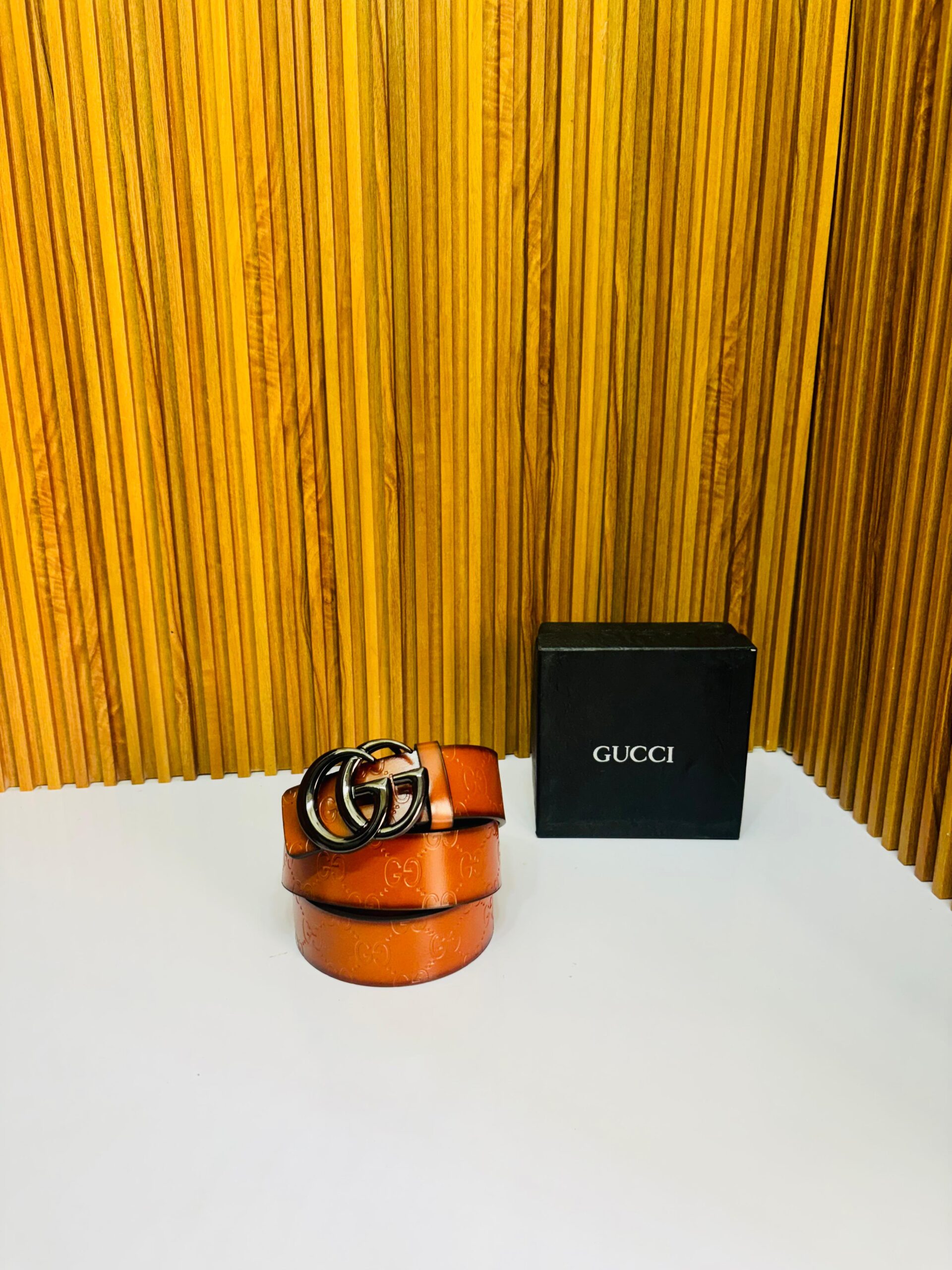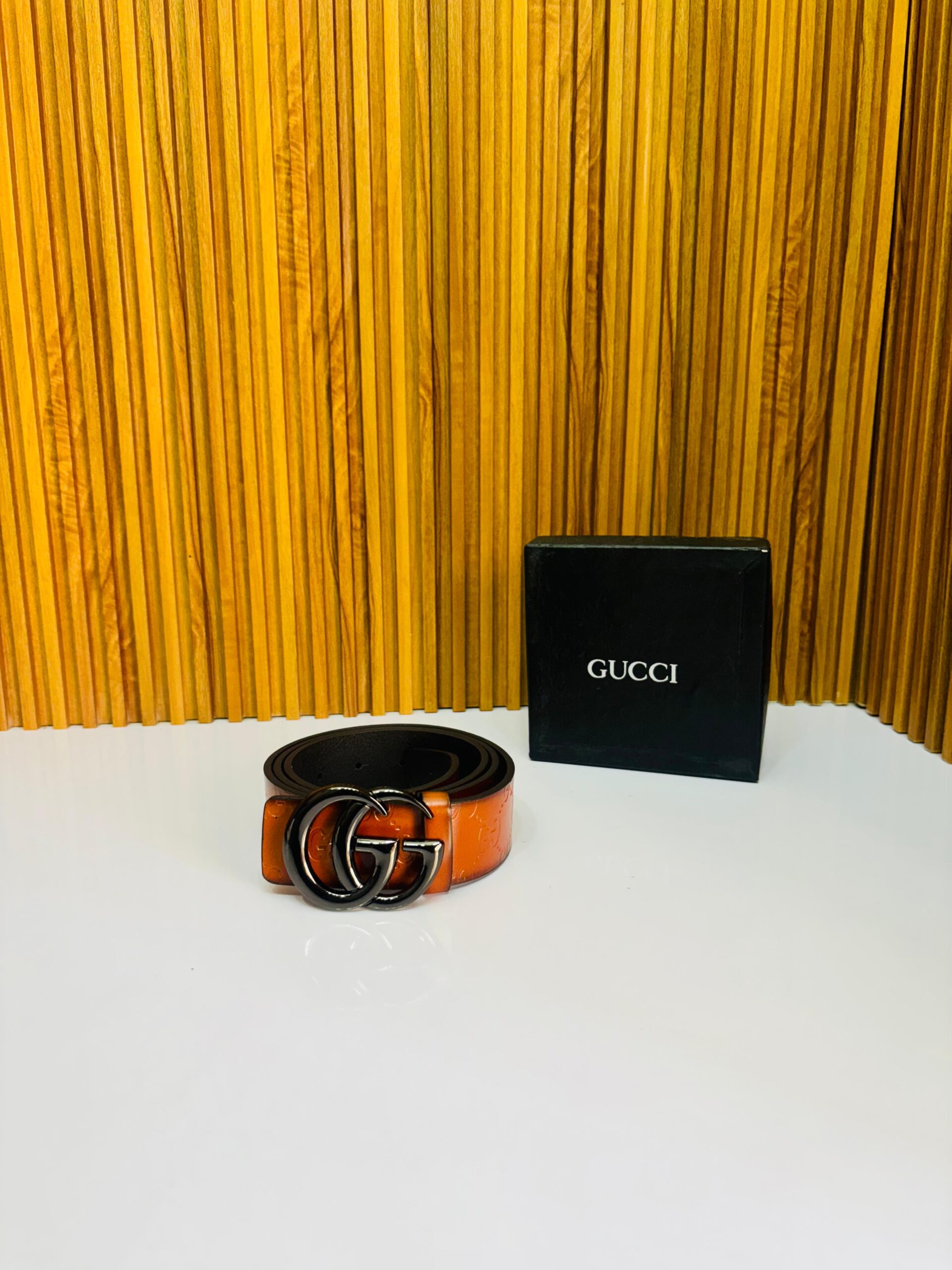 Upgrade your style game with this premium-quality GC First Copy Leather Belt, crafted for those who appreciate the finer things in fashion. Featuring a bold black-on-black embossed GG monogram design and a sleek black double-G interlocking buckle, this belt is the perfect blend of luxury and attitude.
