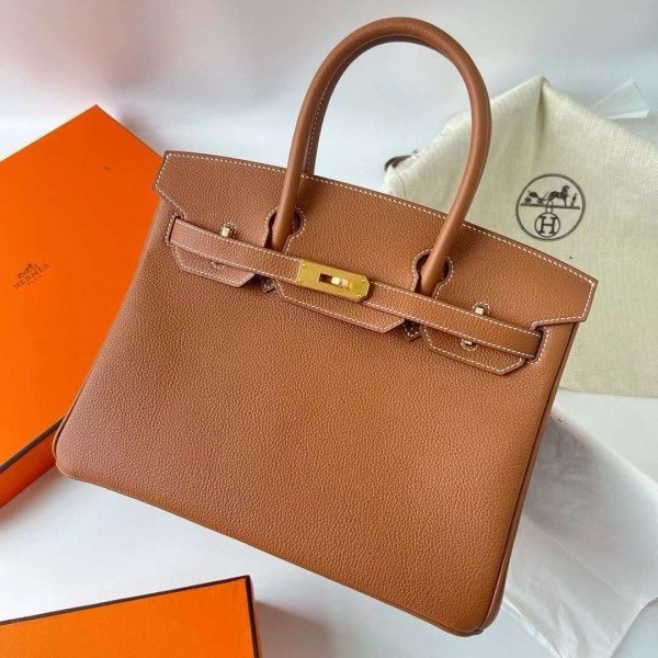 Hermes Brown Togo Leather Rose Gold Hardware Birkin Bag With Dust Bag & OG Box (BK25 Brown)