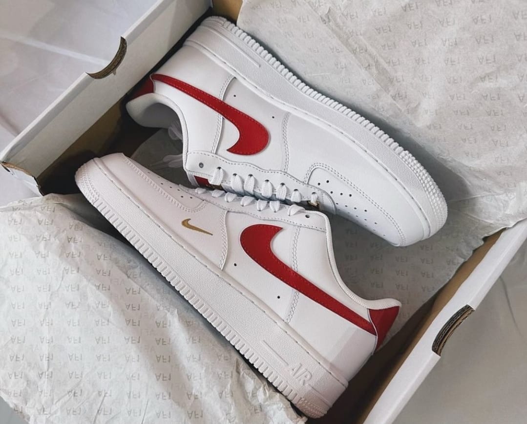 Step up your sneaker game with the legendary NK Air Force 1 Low – Red Swoosh Special Edition. These kicks blend classic design with modern flair, featuring a bold red Swoosh and a unique gold mini Swoosh detail that sets them apart from the crowd.