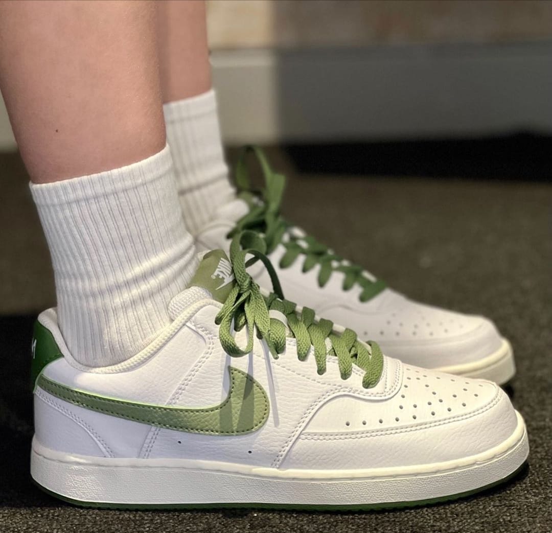 Colorway: White with green accents on the NK Swoosh, laces, and outsole