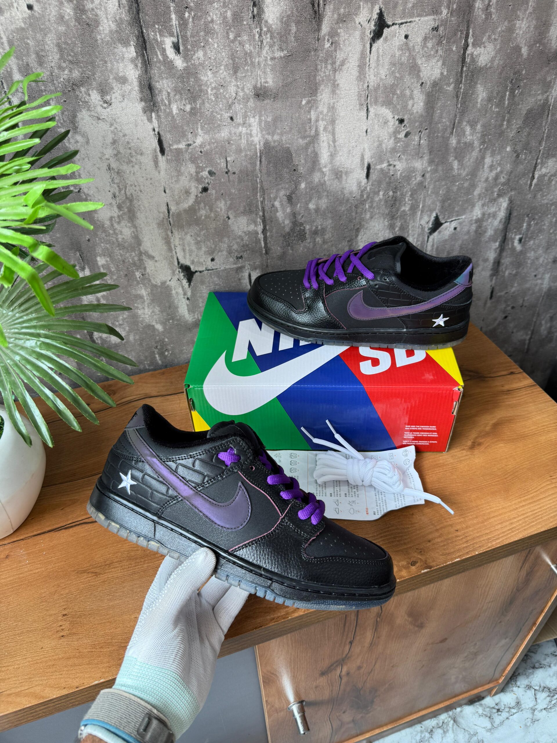 Step into bold street-style with this NK Dunk Low Familia First Avenue 🟣⚫ — a sleek black sneaker detailed with a signature star patch and vibrant purple laces that instantly level up your drip! Perfect for everyday wear, parties, college fits, or sneaker-head collections
