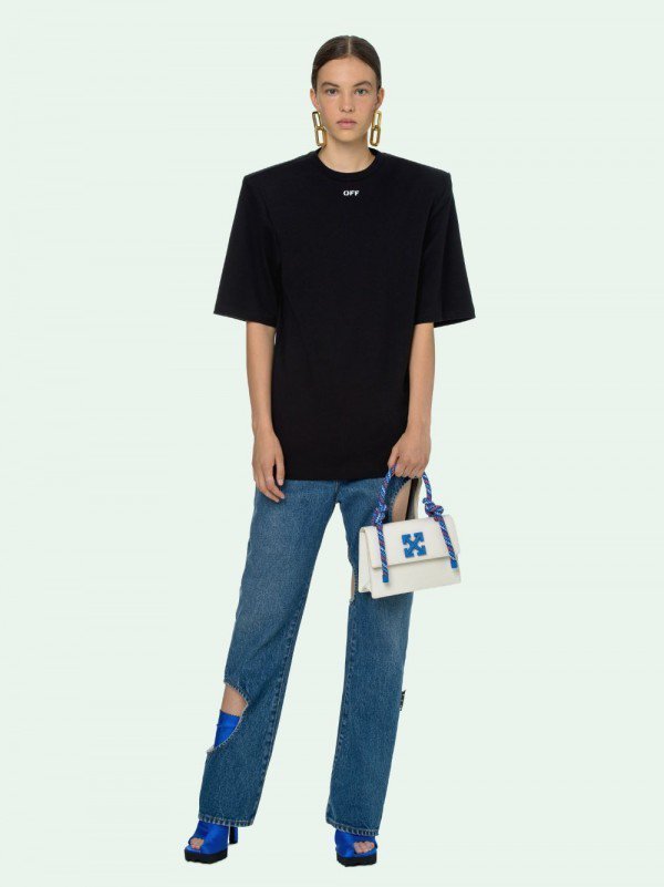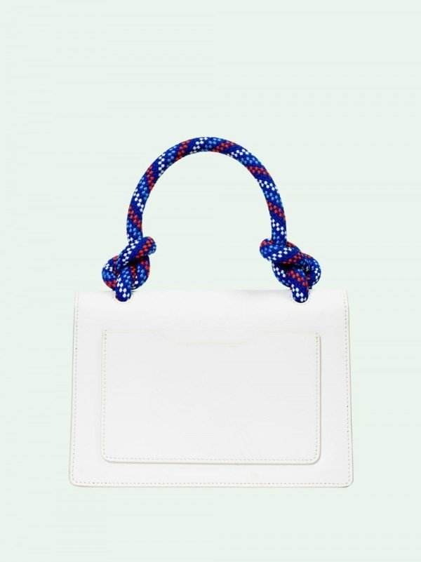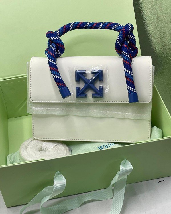 Off-White Leather Insert Gummy white with Metallic Blue Arrows At Front. Rope Handle Jitney 1.4 Shoulder Bag (D88532 White)